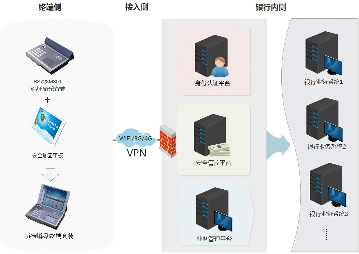 移动终端套装+移动展业管理平台。可以随身携带的非现金银行柜台。